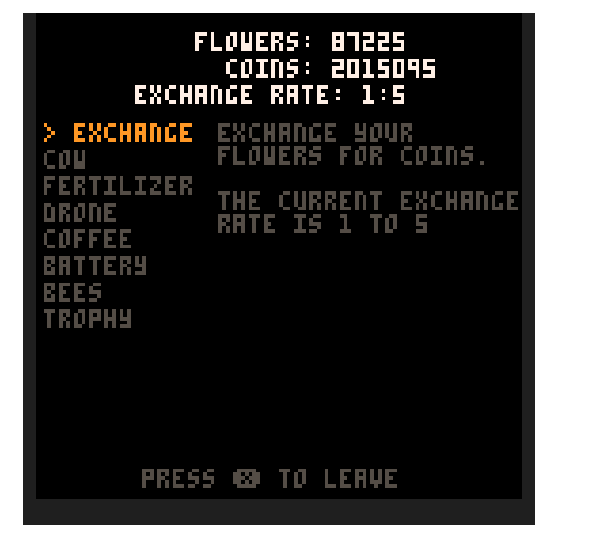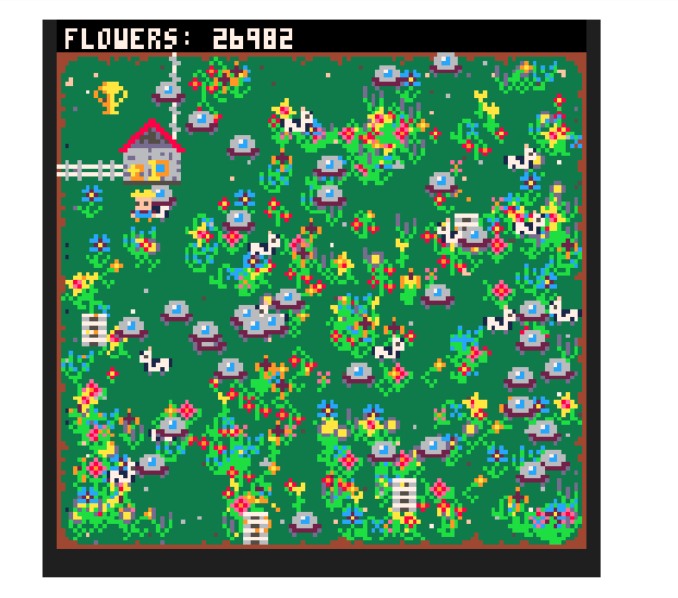 My first pico-8 game! Collect flowers and sell them. Buy tools, animals, and upgrades to help you get the trophy!